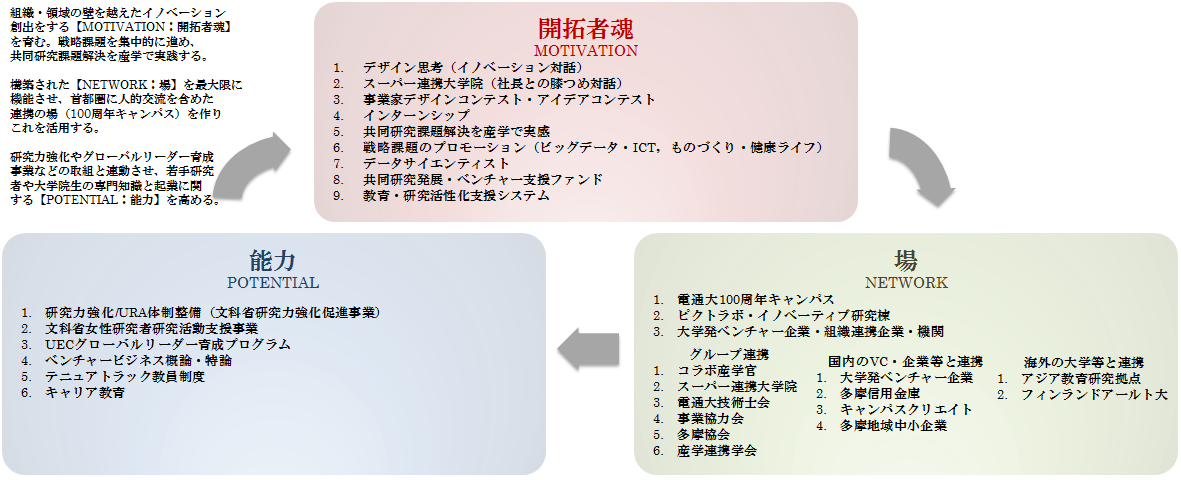 開拓者魂(MOTIVATION)を持ち、場(NETWORK)を機能させ、能力(POTENTIAL)を高めるサイクルを回し、多様な価値が相互に影響しあうことで持続的に人材育成するシステムを構築しています。 エコシステム