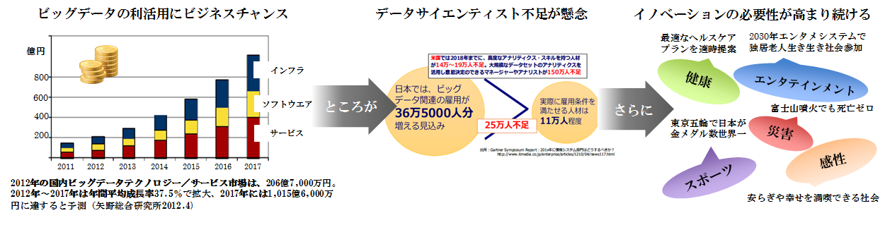 学内外の各機関と緻密に連携し、学生及び企業研究者に対してデータアントレプレナープログラムを提供します。 ビジョン